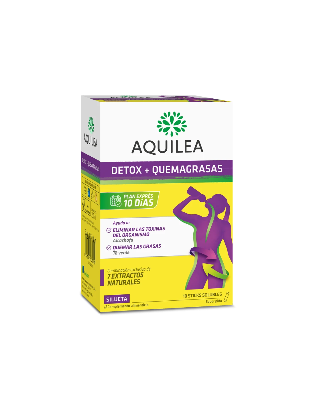 Aquilea Detox + Quemagrasas contribuye a eliminar las toxinas del cuerpo gracias a la Alcachofa y el Abedul; favorece la eliminación de toxinas de la piel gracias al Pensamiento Silvestre, ayuda al confort digestivo gracias al Boldo, ayuda a incrementar la eliminación de agua por parte de los riñones y del tracto urinario gracias a la Cola de Caballo y contribuye a un efecto quemagrasas gracias al Té verde.
