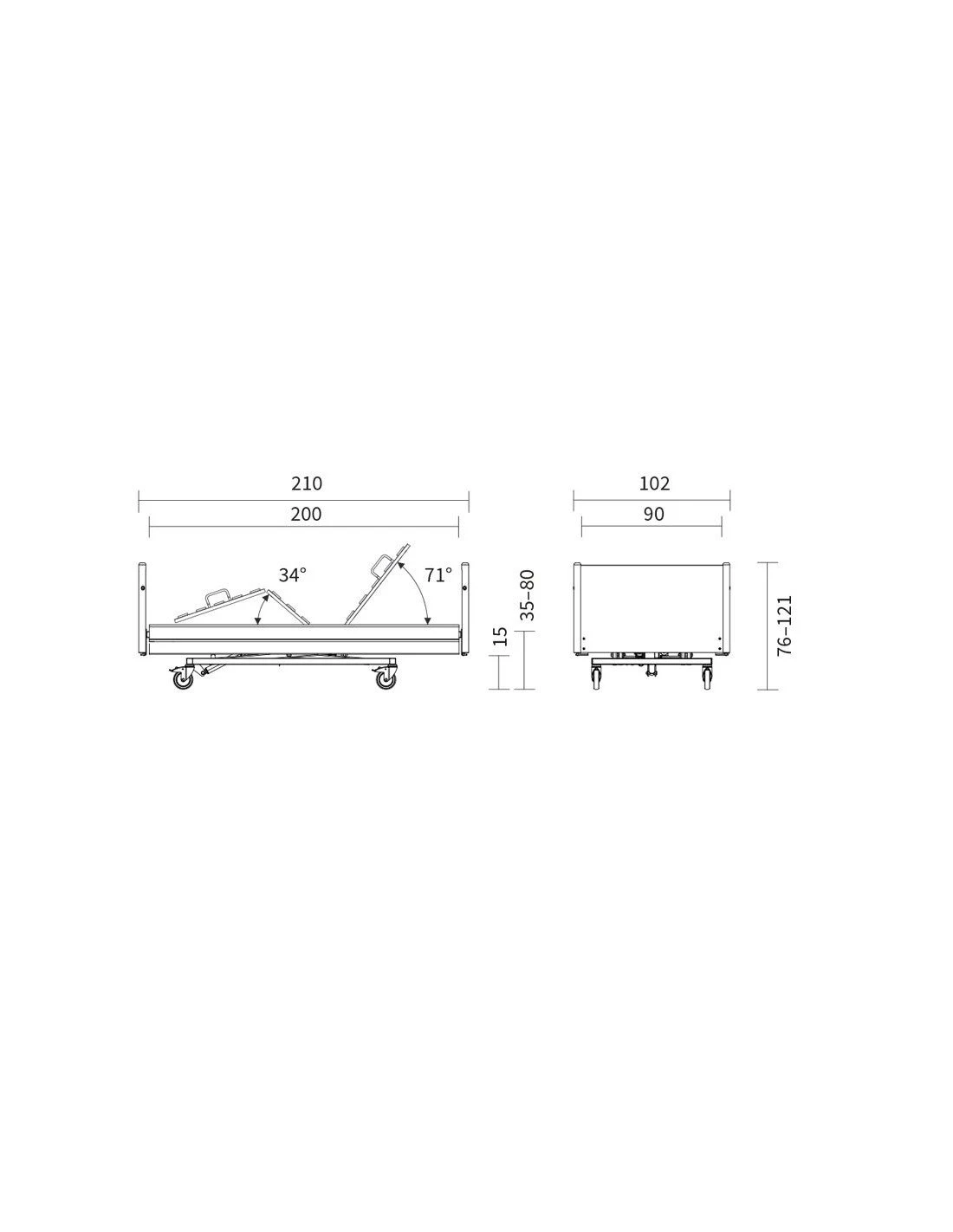 Una cama de 90 x 200 cm con somier de lamas de madera de 4 planos articulados electrónicamente para mayor comodidad del paciente.