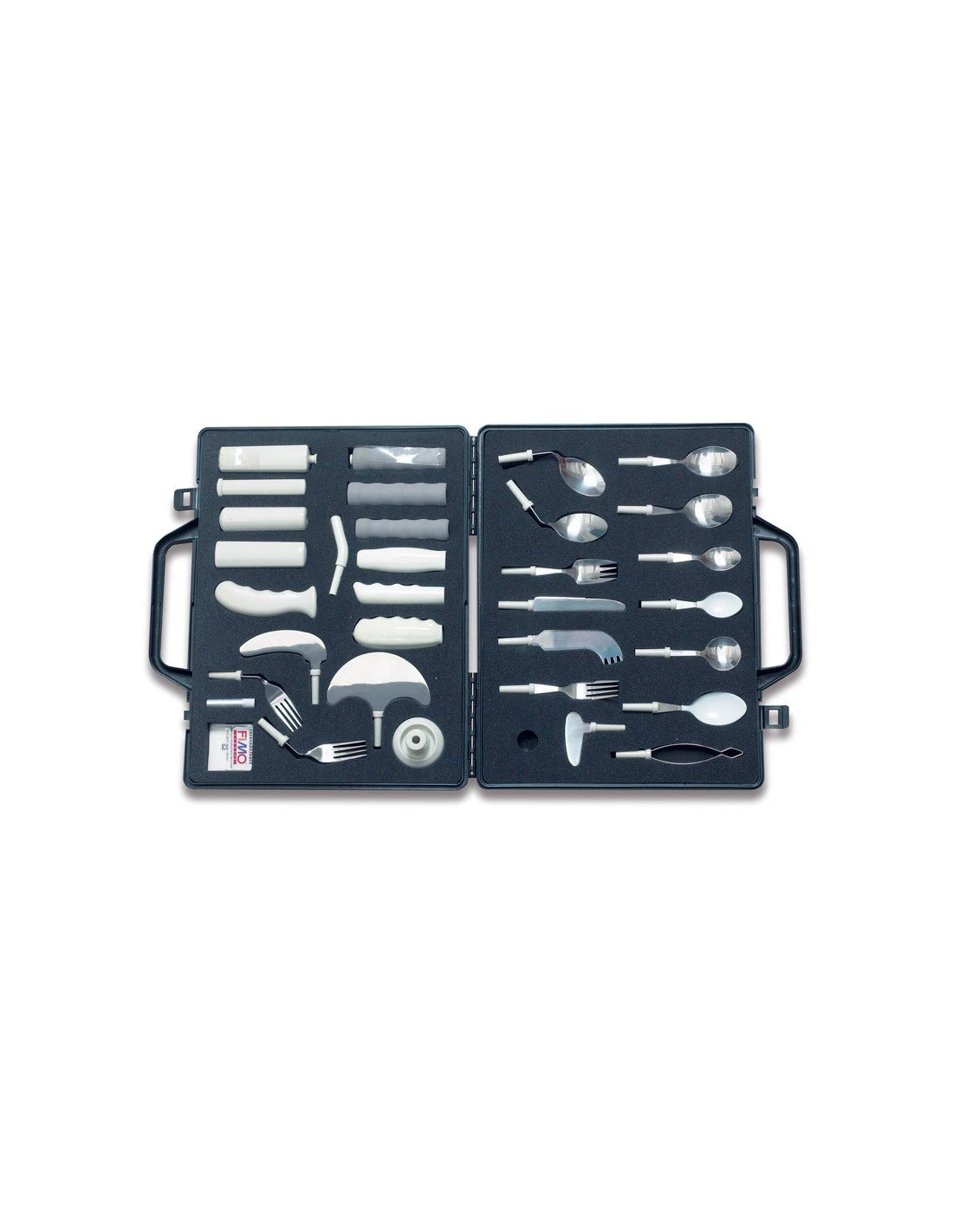Incluye 33 piezas modulares: cubiertos estándar, angulados, con más peso, ligeros, delgados, gruesos, utensilios para hacer cubiertos especiales…