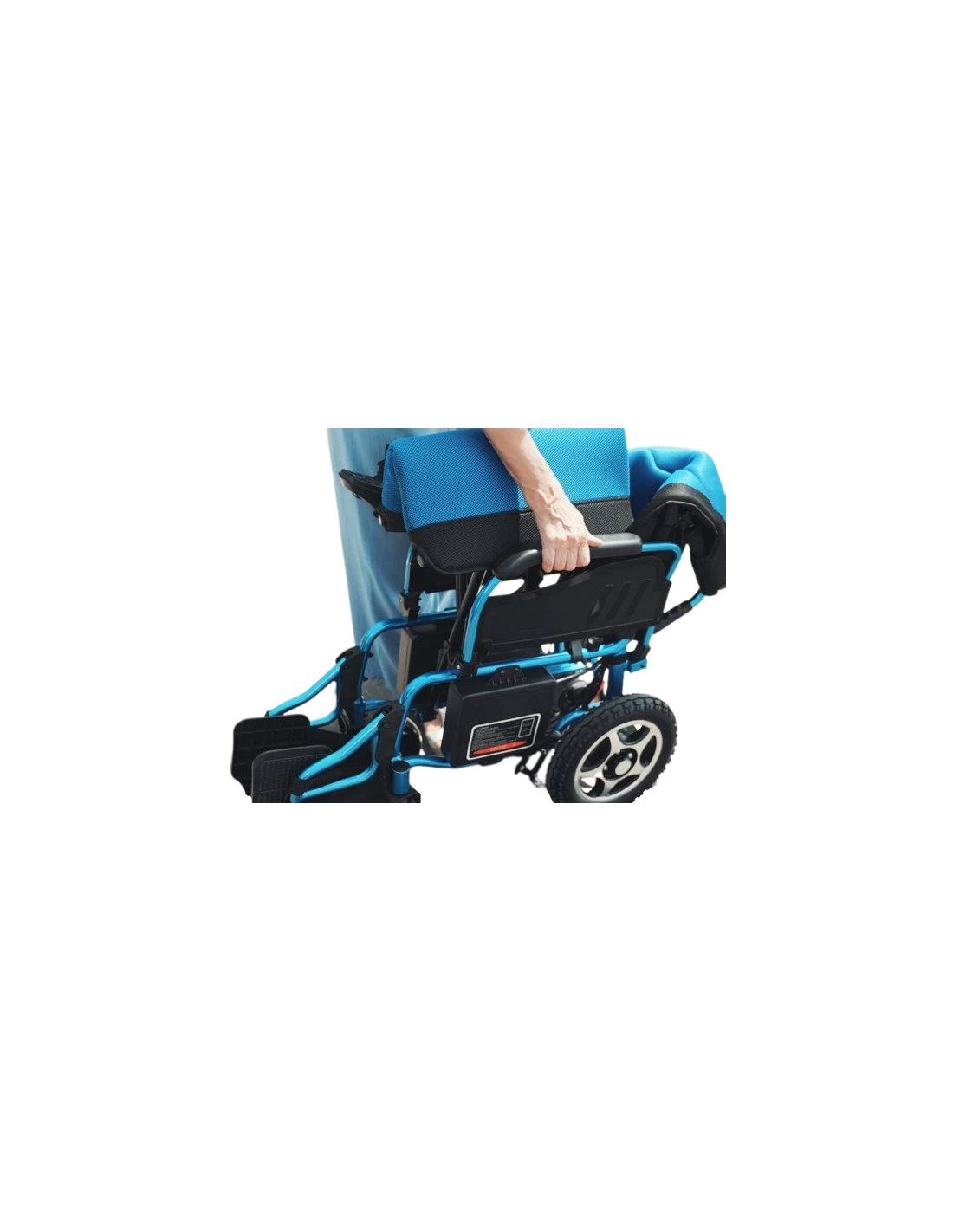 Silla de ruedas eléctrica con chasis de aluminio plegable muy ligero y respaldo abatible, permite plegarse fácilmente sin necesidad de desmontar la batería y cabe en cualquier maletero de un coche.