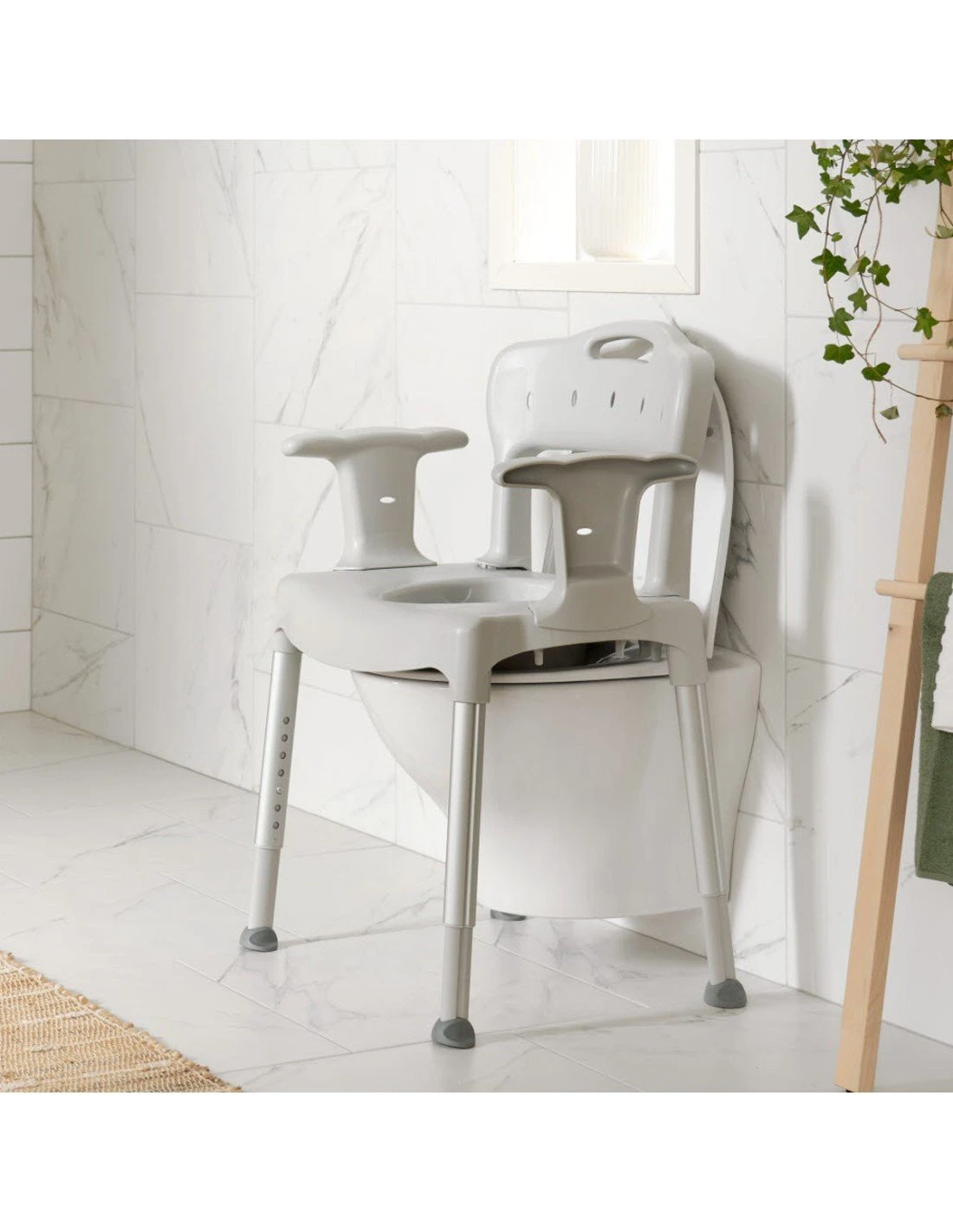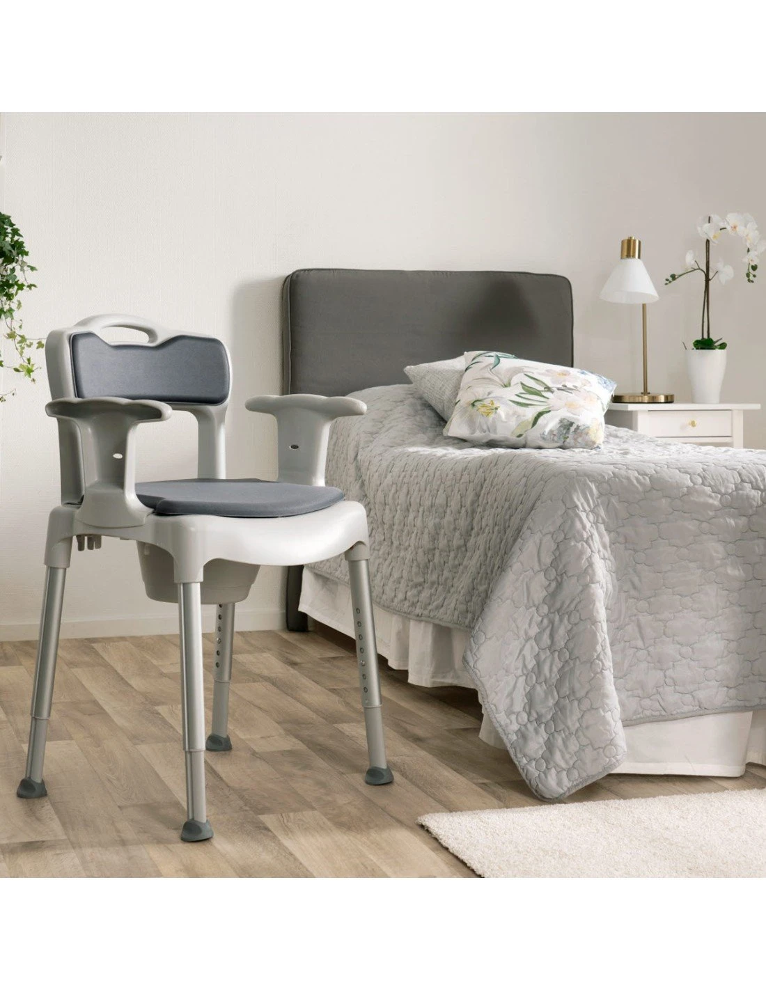 Gracias a su versatilidad puedes utilizarla para vestirte y desvestirte, como WC en el dormitorio, elevador de WC en el baño, o bien puedes retirar el tapizado y utilizarla como silla de ducha.