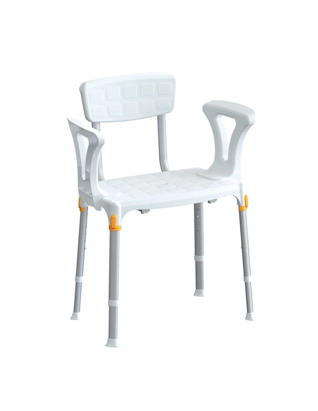 Silla de ducha y baño con reposabrazos desmontables, una silla ligera fabricada en aluminio, con altura regulable y respaldo desmontable, que ofrece un mayor soporte y confort al usuario.