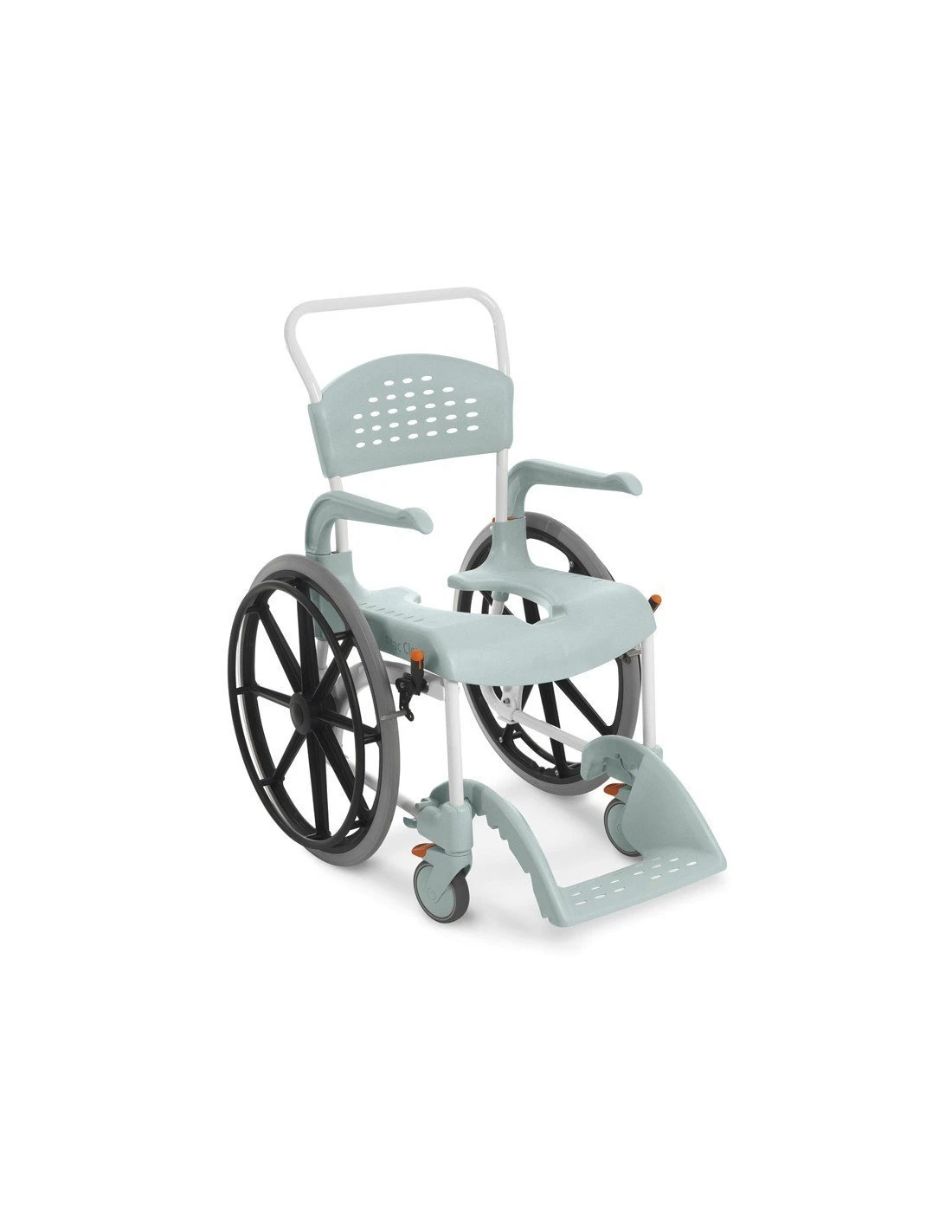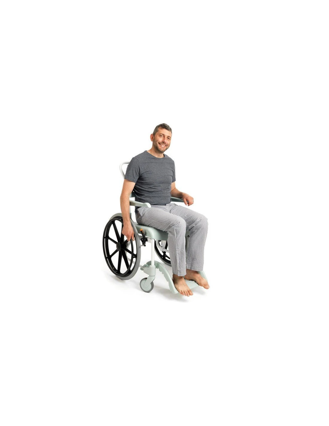 Silla de ducha y WC muy cómoda y equilibrada con ruedas de 24″ (600mm) que permiten al usuario impulsarla para disfrutar de una mayor libertad de movimiento e independencia durante la higiene.