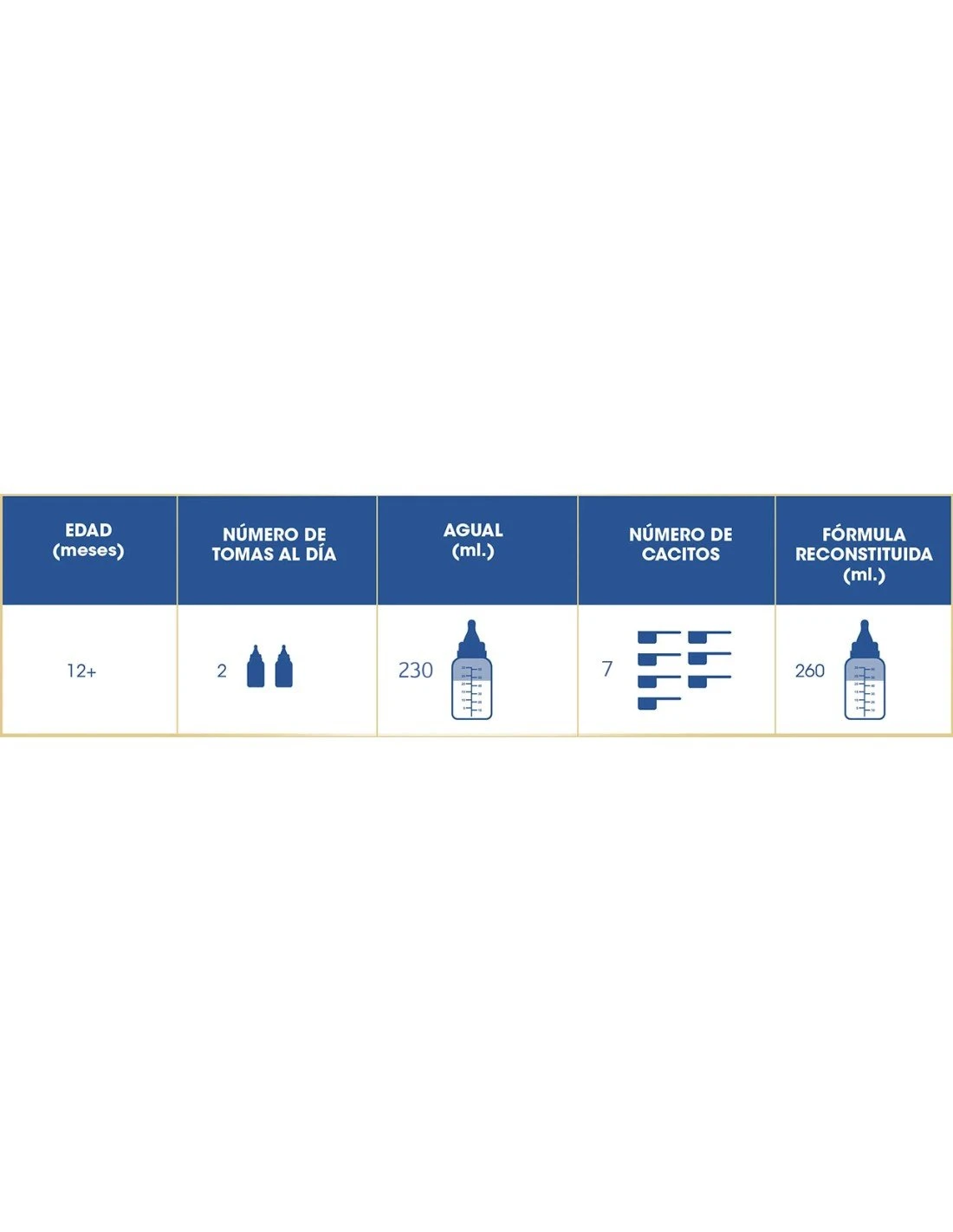 Jarabe de glucosa, leche desnatada, leche entera, aceites vegetales (oleína de palma, aceite de nabina, aceite de soja, aceite de coco y aceite de girasol alto en ácido oleico), sacarosa, lactosa (de la leche), aceite con alto contenido de DHA (pescado), fosfato cálcico, emulgentes (lecitina de soja, mono y diglicéridos de ácidos grasos), caseína (de la leche), carbonato cálcico, estabilizador (fosfato potásico), citrato sódico, fosfato magnésico, bitartrato de colina, L-ascorbato sódico, taurina, citrato potásico, sulfato ferroso, etil vainillina, cloruro sódico, sulfato de zinc, nicotinamida, cloruro de colina, antioxidante (palmitato de ascorbilo), acetato de DL-alfatocoferol, cloruro cálcico, pantotenato cálcico, clorhidrato de piridoxina, sulfato cúprico, palmitato de vitamina A, clorhidrato de tiamina, riboflavina, sulfato de manganeso, ácido fólico, selenito sódico, yoduro sódico, fitomenadiona, colecalciferol, cianocobalamina y biotina.