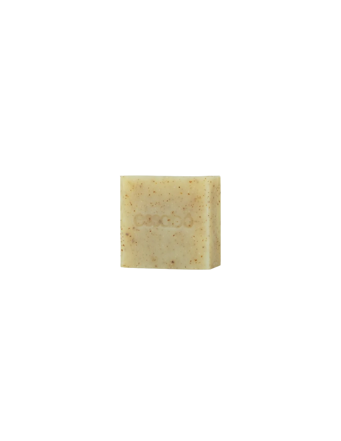 Jabón de baño ecológico en pastilla de acción exfoliante con base de Aceite de Coco de Filipinas y Aceite de Oliva de España enriquecido con Aloe Vera y cáscara de Almendra molida.