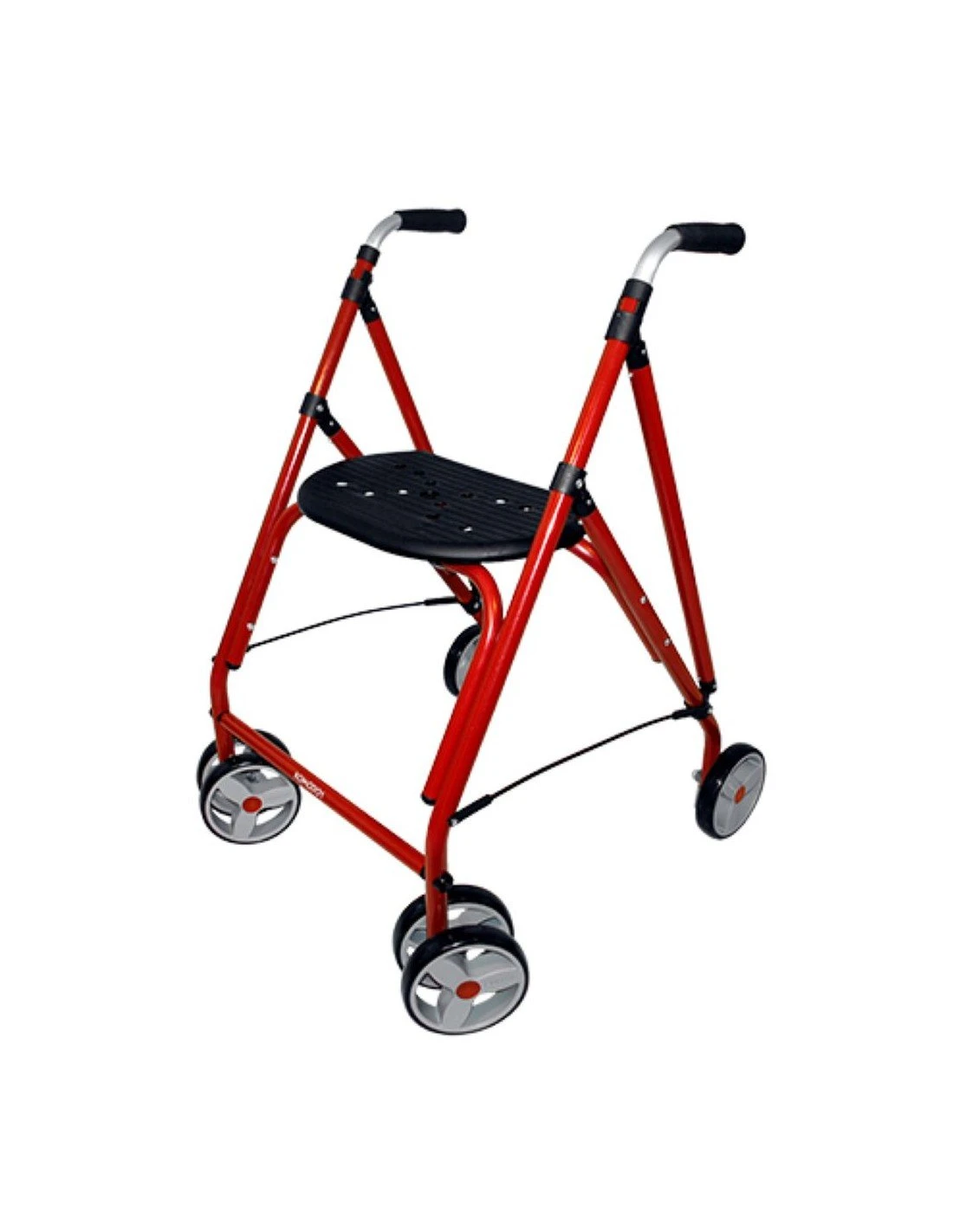 El andador Komodo-1 cuenta con asiento, empuñadura de goma regulable en altura, dobles ruedas delanteras giratorias y rueda trasera con freno por presión para mayor seguridad.