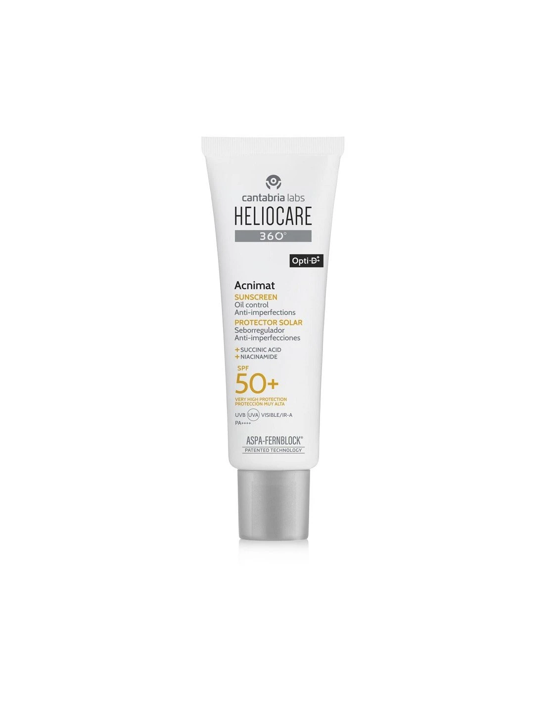 Heliocare 360 Acnimat es una protección facial SPF50+ de amplio espectro (UVB, UVA, visible, infrarroja) para uso diario con acción seborreguladora, anti-imperfecciones y acabado matificado especialmente formulada para la piel grasa con tendencia acneica.