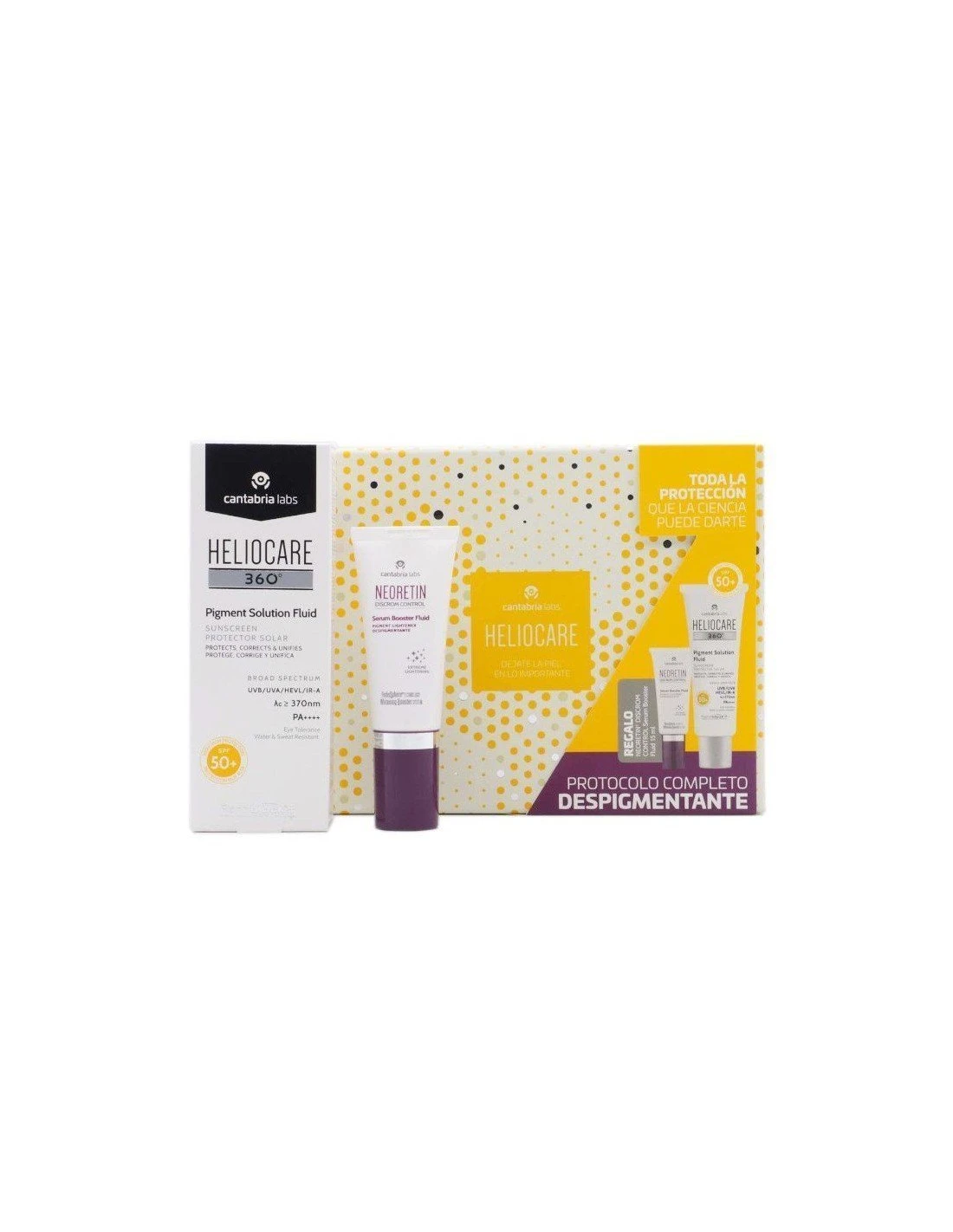 Protocolo despigmentante que incluye el fotoprotector SPF50+ de textura ultraligera para prevenir y corregir las hiperpigmentaciones solares y unificar el tono de la piel junto a un sérum despigmentante Neoretin Discrom Control 15ml ¡¡¡de REGALO!!!