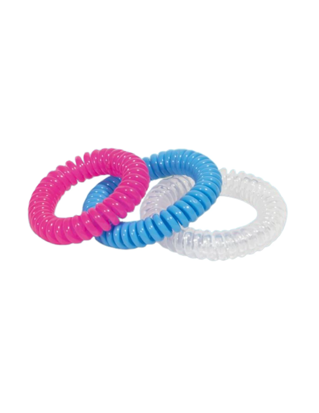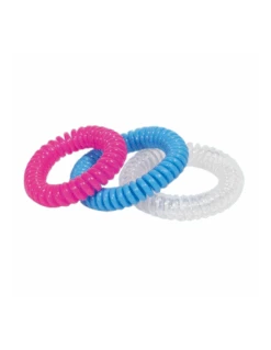 Pulseras aromatizadas con citronela, un aceite esencial que repele los insectos, con un moderno diseño de plástico con forma de espiral en 3 colores diferentes.