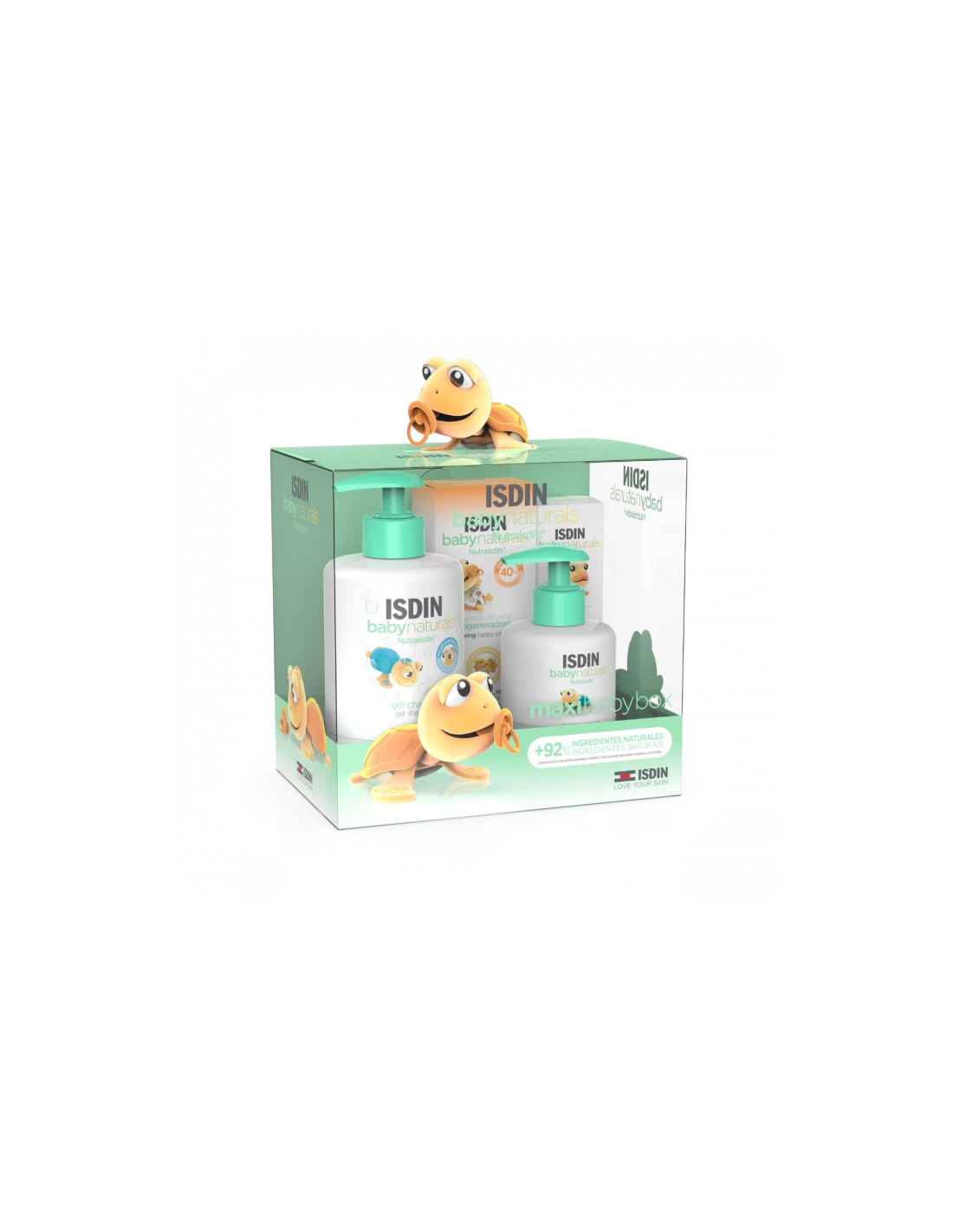 Canastilla de Isdin Baby Naturals diseñada para cuidar la piel del bebé. Contiene Babynaturals Gel Champú 400ml, Babynaturals Loción Corporal 200ml, Babynaturals Pomada ZN40 100ml y Babynaturals Reparador Perioral 15ml.