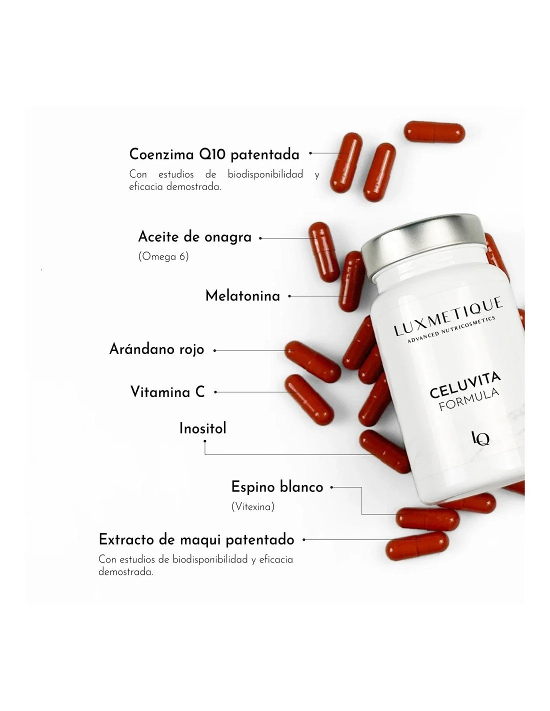 Celuvita Fórmula de Luxmetique es un complemento alimenticio con una fórmula innovadora que combina 8 potentes activos altamente biodisponibles para ofrecerte protección antioxidante y antienvejecimiento, ayudarte a regular los ciclos de sueño y a aliviar los cambios hormonales femeninos durante el climaterio.