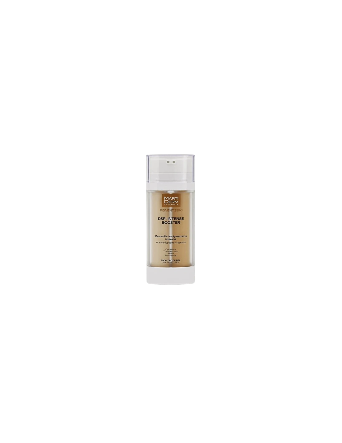 MartiDerm DSP Intense Booster es una mascarilla despigmentante de acción intensiva que combina Retinol con Cisteamina, una combinación despigmentante y renovadora única y altamente eficaz enriquecida con Ácido tranexámico y Niacinamida.