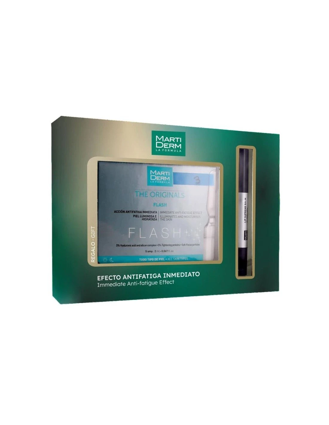 Compra MartiDerm Pack Lip Supreme Balm 4ml + 5 Ampollas Flash en Farmagranada para mejorar la hidratación y luminosidad de la piel.