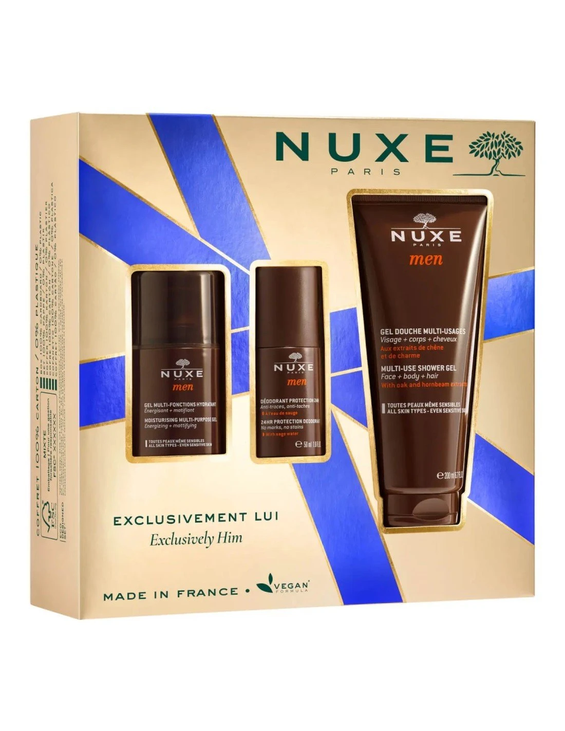 Fantástico cofre de regalo con tres productos esenciales de cuidado corporal masculino de Nuxe, una combinación de indispensables exclusivamente para él: