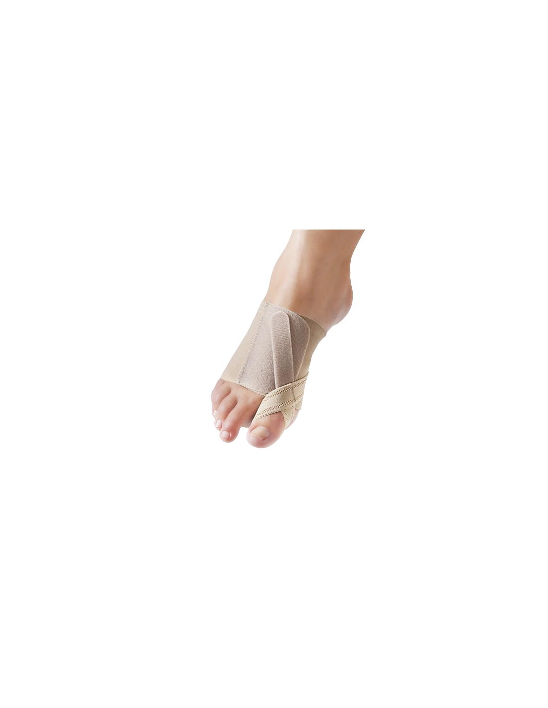 Se compone de una banda elástica que envuelve el mediopié y una cincha elástica y maleable con gel que envuelve el primer dedo del pie adaptándose perfectamente para favorecer su alineación gradual con una intensidad de corrección totalmente ajustable.