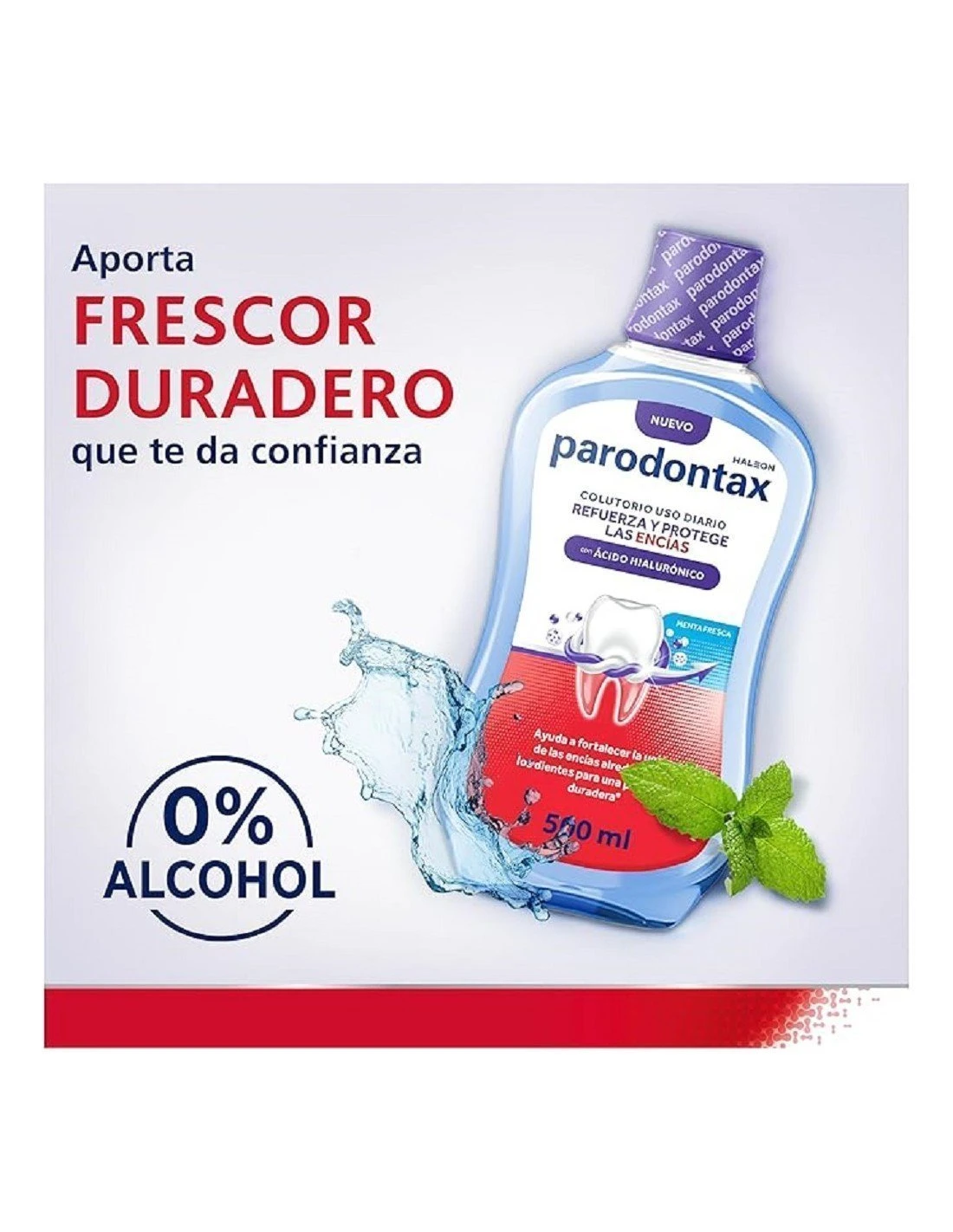Parodontax Refuerza y Protege Encías es un colutorio de uso diario con Ácido Hialurónico que refuerza y protege las encías, previene la acumulación de placa bacteriana entre los dientes y en la línea de las encías para una higiene bucal óptima.