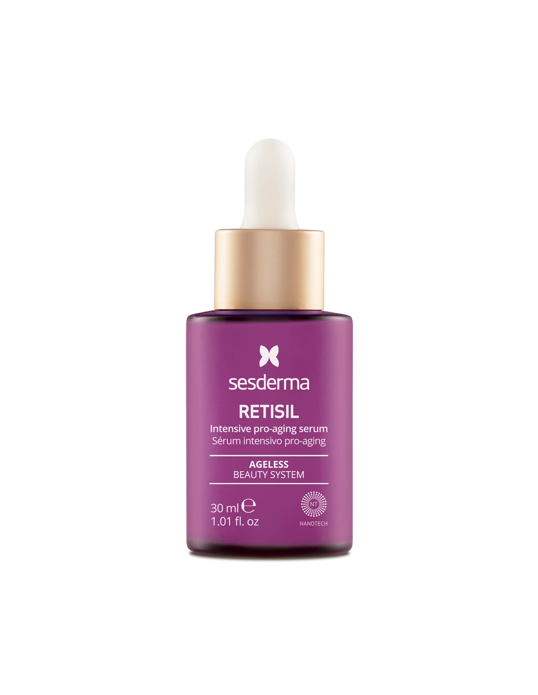 Sesderma Retisil Sérum es un tratamiento de acción intensiva para todo tipo de pieles con una fórmula avanzada que mejora de forma global los signos del envejecimiento en rostro, cuello y escote: