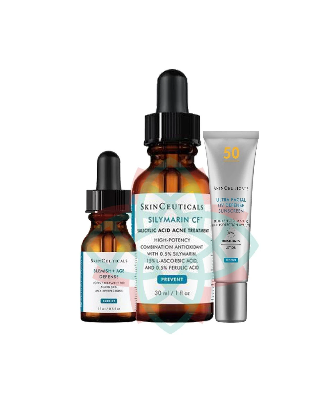 Por las noches te recomendamos retomar tu protocolo de cuidado facial, iniciándolo como por la mañana, con una limpieza al agua, secando tu rostro y aplicando el serum Skinceuticals Blemish Age Defense, para complementar el tratamiento de Silymarin CF (que aplicarás de día). Por último, termina tu rutina con el reconfortante toque de hidratación que aporta Skinceuticals Daily Moisture. Por supuesto te recomendamos que no dejes de utilizar otros productos de cuidado diario como son contorno de ojos, tónico, etc.