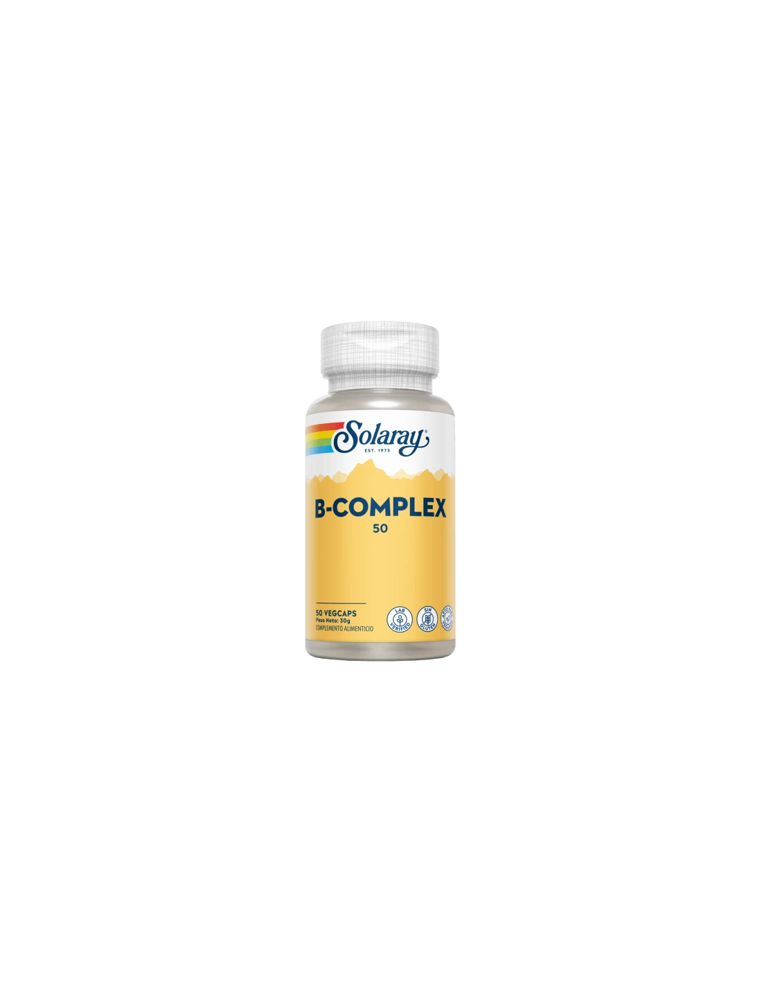 Solaray B Complex 50 te ayuda a cubrir las necesidades diarias de vitaminas del grupo B para asegurar el correcto funcionamiento del organismo.