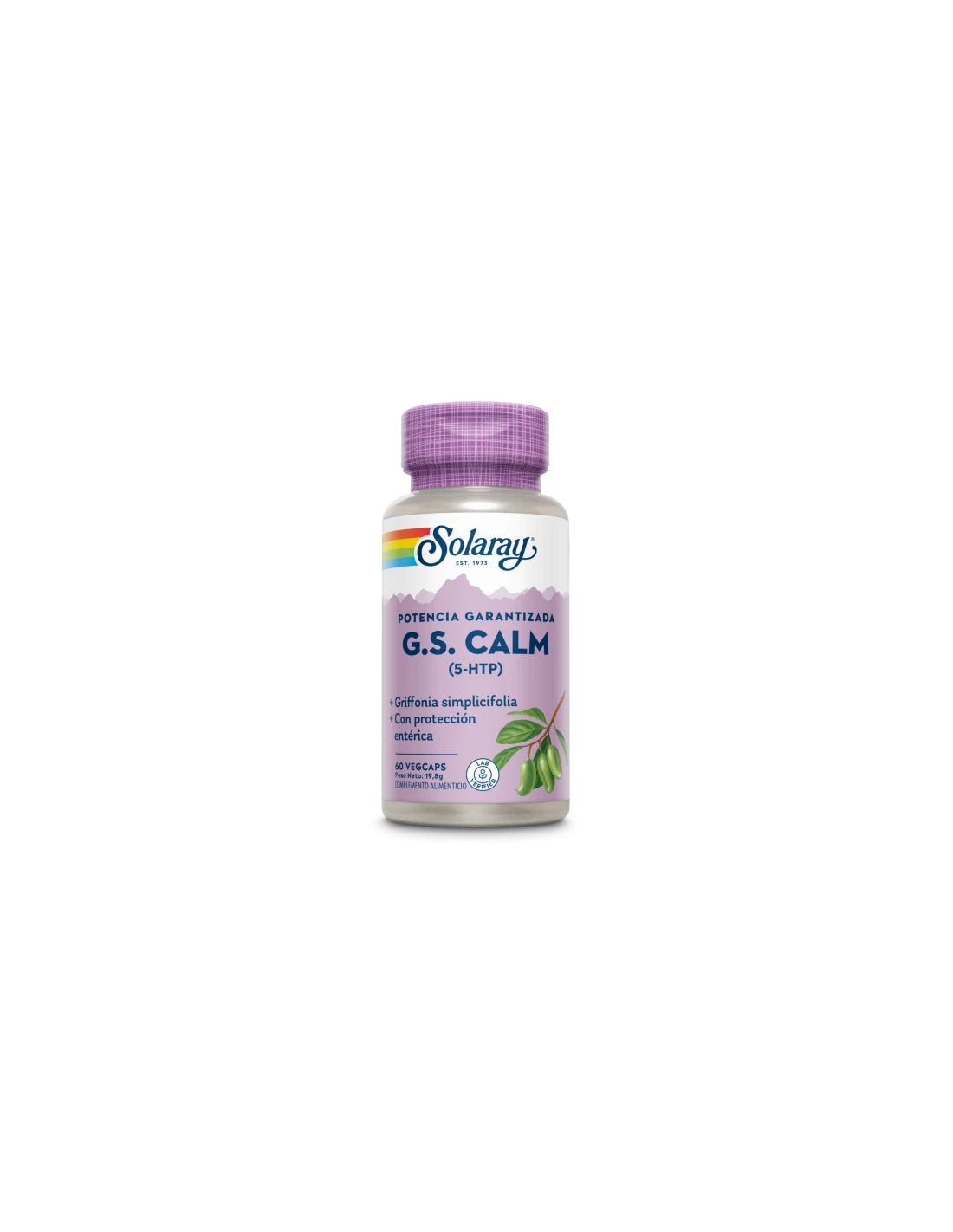Solaray G.S. Calm es un complemento alimenticio con Extracto de Griffonia Simplicifolia para la regulación del sueño, el apetito y el estado de ánimo.