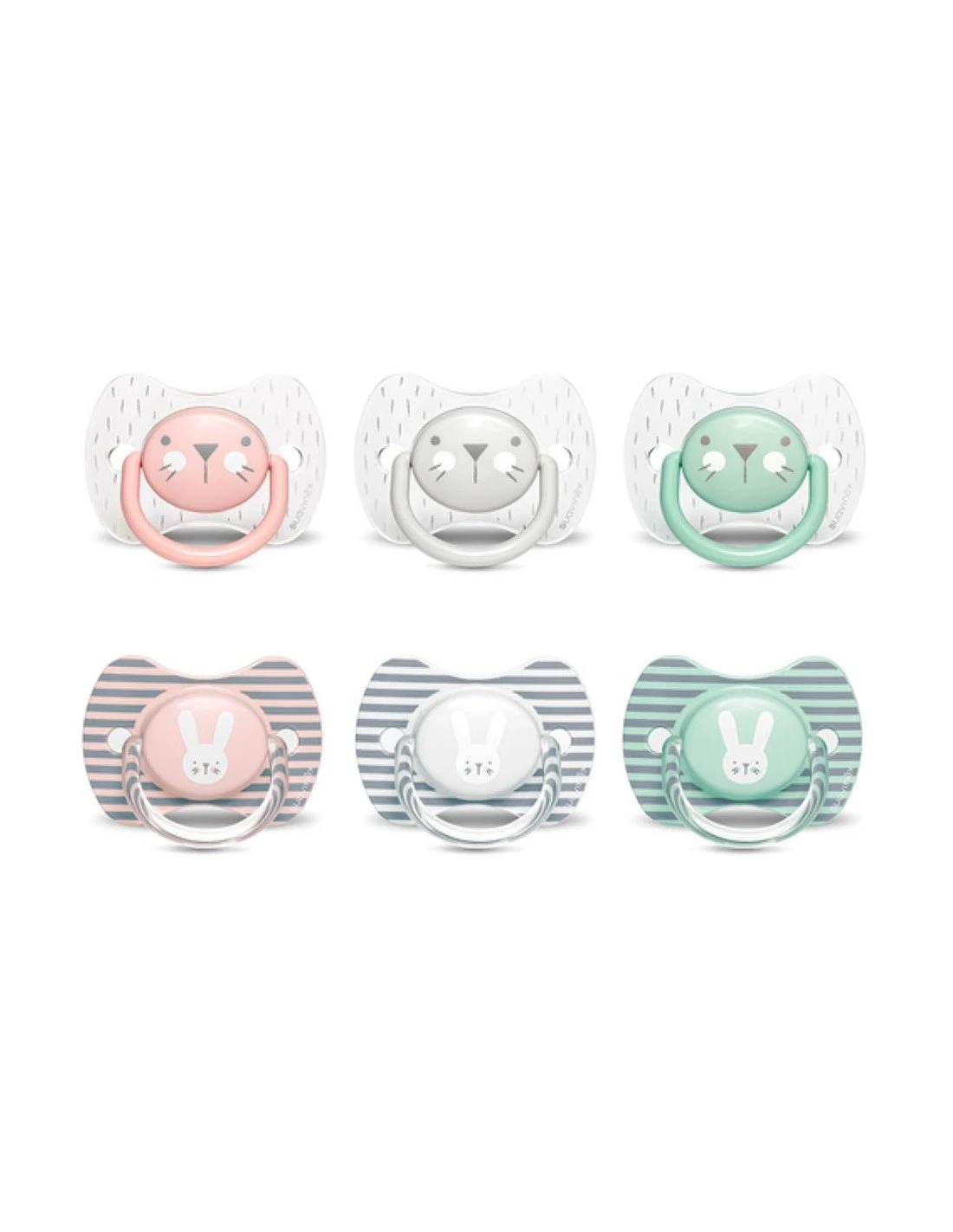 Su sistema protector evita irritaciones y rozaduras por acumulación de saliva en la delicada zona peri bucal. El canal de circulación incorporado en la parte interior posibilita, no sólo la circulación de aire entre la piel y el chupete, sino también la expulsión de la saliva que pudiera quedar retenida.