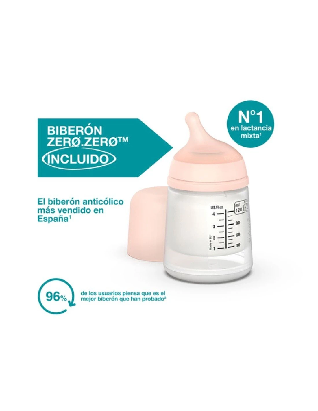 Incluye un biberón Zero Zero con un exclusivo sistema anticólicos que reproduce las glándulas mamarias durante la succión. Su exclusivo sistema con bolsa anticólico hace desaparecer las burbujas para evitar la ingesta de aire y reducir los cólicos gaseosos del bebé.
