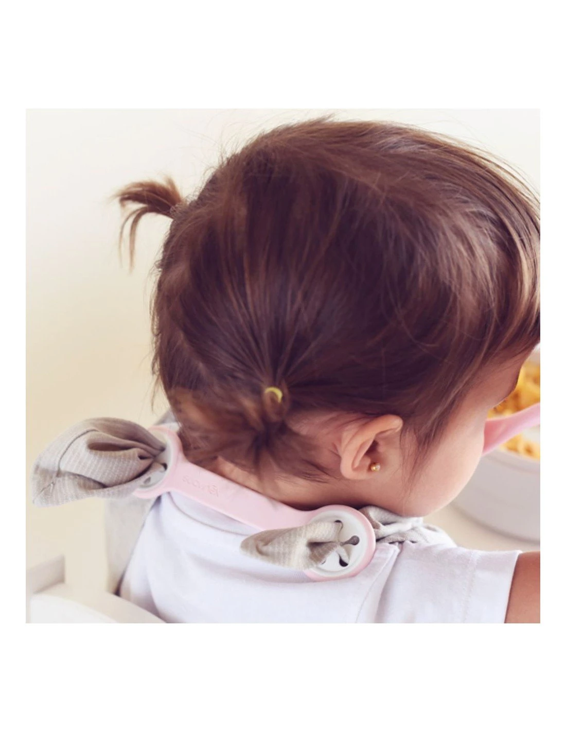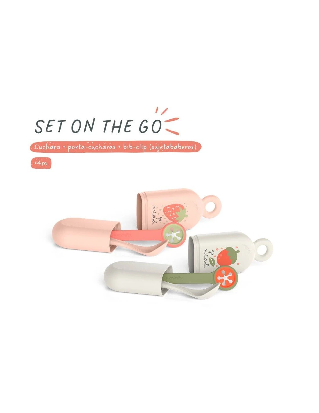 Práctico set para cuando estás fuera de casa que incluye un estuche con una cuchara de diseño ergonómico y un sujeta baberos (Bib-Clip) que permite convertir una servilleta en un babero improvisado.