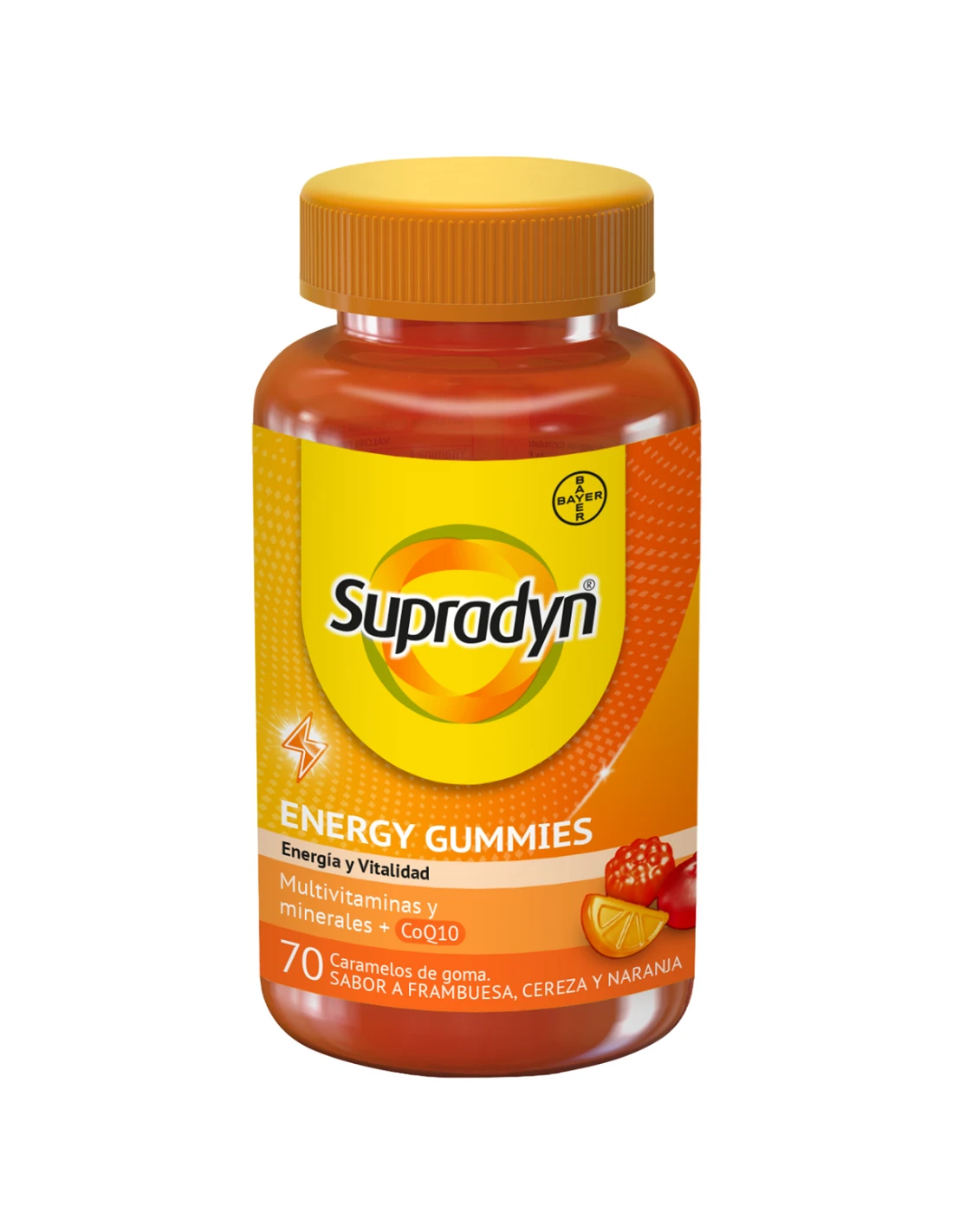 Supradyn Energy Gummies es un complemento alimenticio multivitamínico para adultos que proporciona una combinación de Vitaminas A, B, C y D y Coenzima Q10 en unos deliciosos caramelos de goma de tres sabores frutales (frambuesa, cereza y naranja).